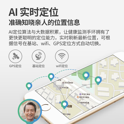 适合父母使用的智能手环,支持AI实时定位,清晰了解亲人所在位置。配合摔倒报警功能,自动发送求救信息,父母出行,家人安心。