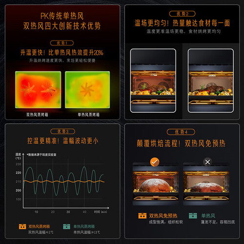 温度均衡的双驱循环热力系统,由外到内烘烤到位,成品色泽更饱满。视网膜级别的高清全面屏,菜谱图文并茂,交互体验更佳。