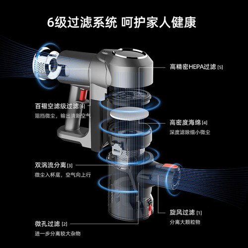 搭载六级过滤机制,深层过滤更到位,杜绝二次污染。配备多款刷头,轻松洁净全屋各个场景,大扫除好不费力。