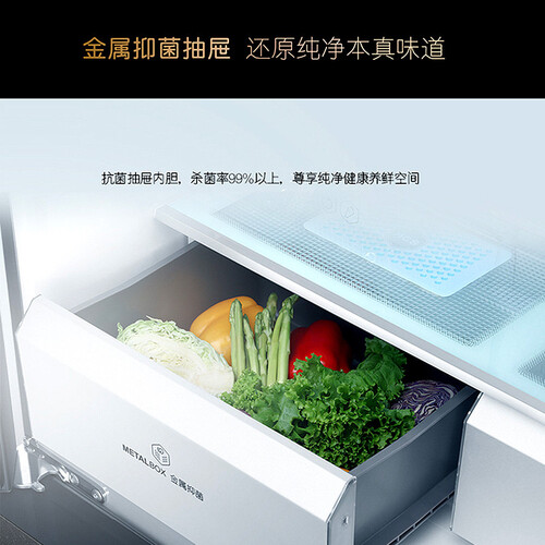 金属抗菌抽屉,保持食材的干净卫生,呵护我们的身体健康。独立制冰空间,方便冰块的生成,热天取冰更容易。