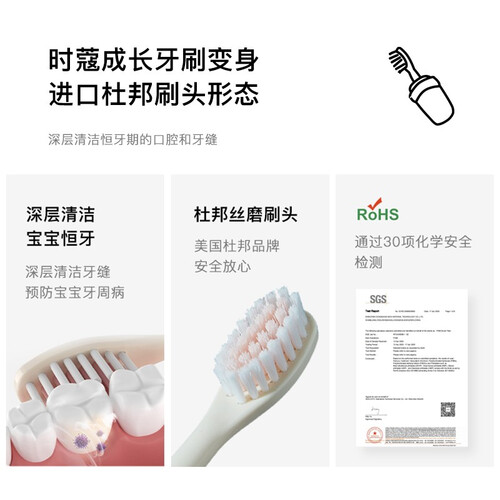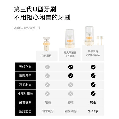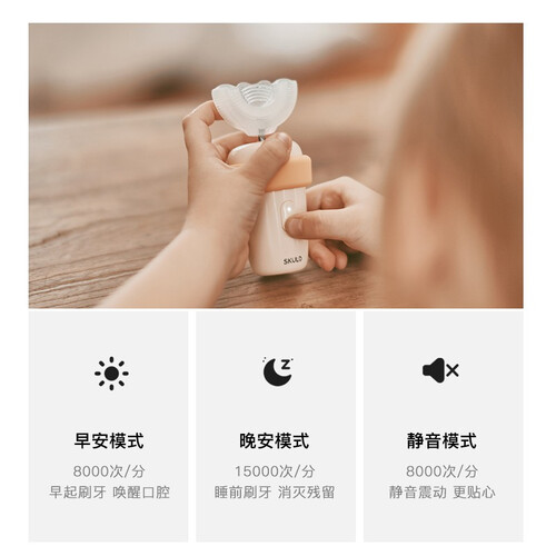 配备风干抑菌+紫外消毒底座,牙刷不易滋生细菌,时刻保持洁净卫生。拥有一键启动功能,方便宝宝自行操作,锻炼自主生活能力。