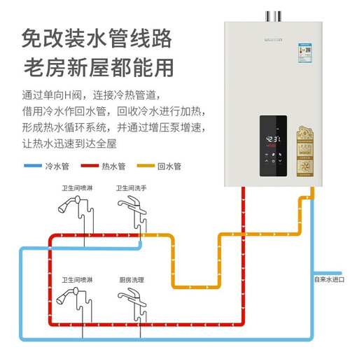 采用创新单项H阀,可免除改装水路管道,新老房屋可即装即用。同时内置静音直流增压泵,可在低压条件下启动燃气热水器。