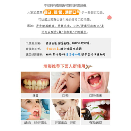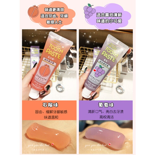 嗜喱果冻状的膏体,遇水可打出丰富泡沫,温和清洁牙齿。清爽的葡萄味,带来清新的感觉,去除口腔异味,留香持久。