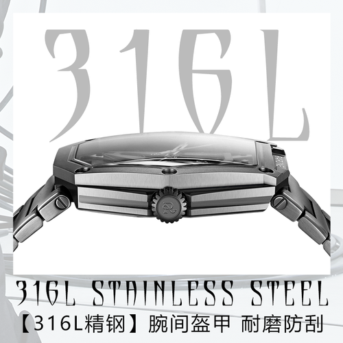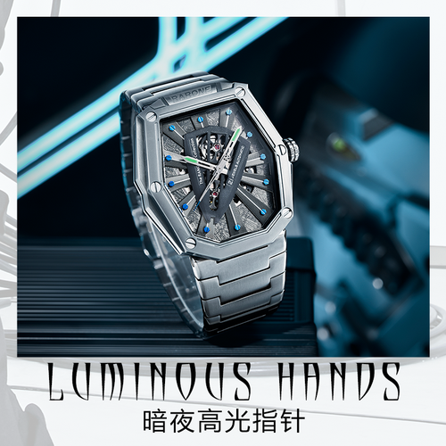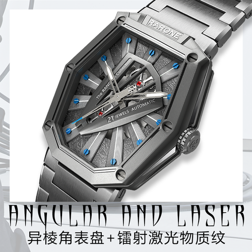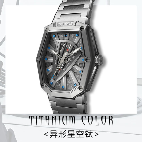 前卫不规则异形表壳,打破传统非方即圆界限,散发时尚潮流气息。高温化学油压锻造陨面纹理,好品质从细节呈现。