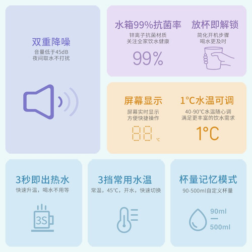水箱所具备的99%抗菌率,避免污染缔造洁净水源。搭配双重降噪设计,让噪音低至45dB,不会打扰家人的日常生活。