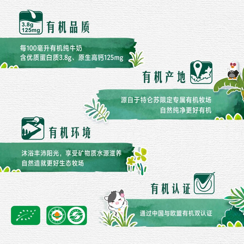 奶源通过中欧有机双认证,品质有保障,牛奶中原生高钙达125mg/100ml,营养丰富。梦幻盖便携设计,即开即饮轻松畅享。