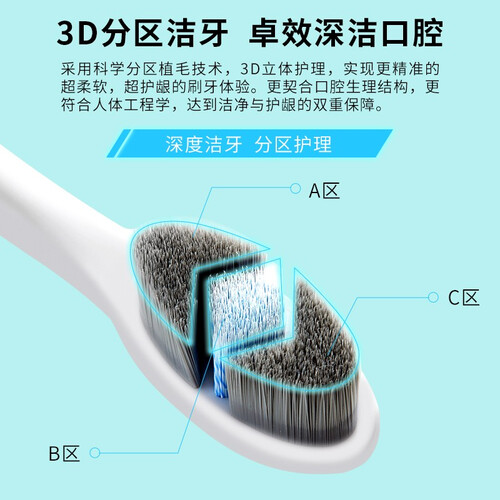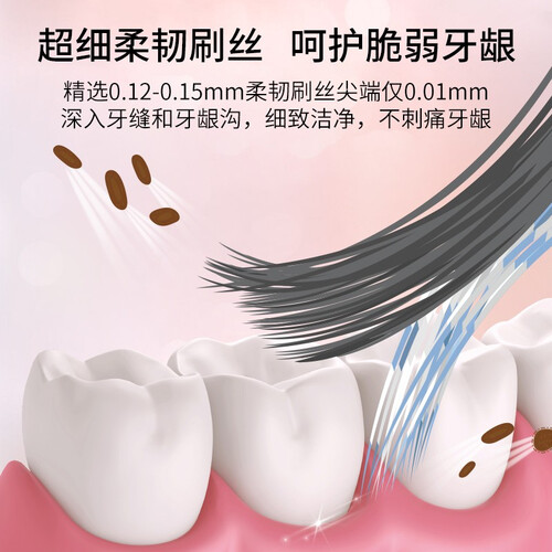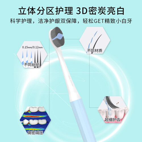 高密度柔软刷毛,棉花般的绵软触感,温和护齿不伤牙釉质。纤细小巧刷头设计,可以到达口腔深处,灵活清洁无死角。