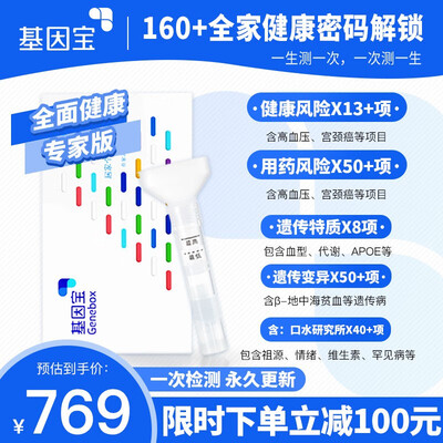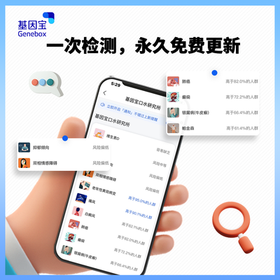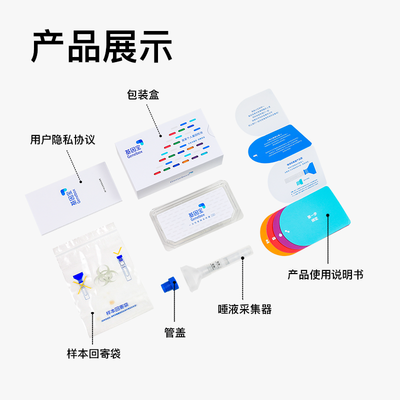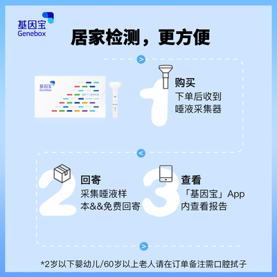 2ml唾液居家自检,包含祖源分析、遗传特质、遗传病筛查、用药风险提示、健康风险评估,1V1专家咨询,全方位解读。