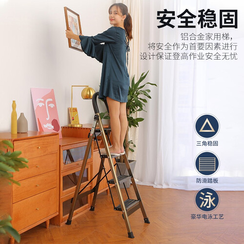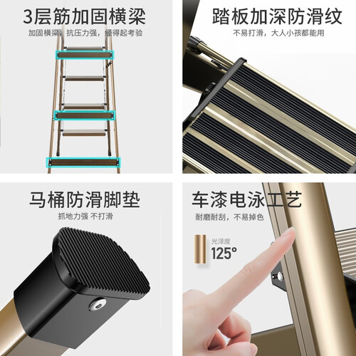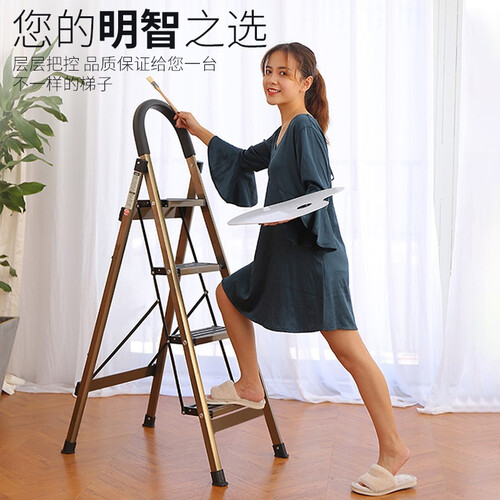 梯子采用了折叠设计,收纳起来可以靠在墙角,不占空间,经过电泳工艺处理,表面光滑亮泽,不易掉漆和磨损。