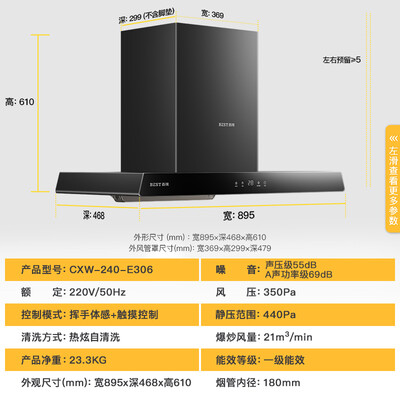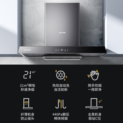 具备一键自动清洗功能,高温溶解油污,真正解放双手。440Pa的大静压设计,做饭高峰期畅快排烟,拒绝拥堵和倒灌。
