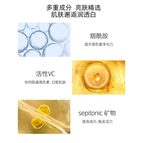 烟酰胺成分,可净化色素避免沉着,均匀提亮肤色。糖海带提取物,可抑制色素生成,提升肌肤通透白皙,尽显光泽。