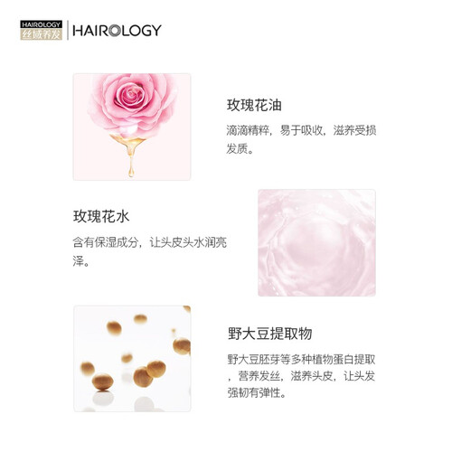 富含植物精粹成分,营养可直达发芯,锁水保湿,秀发滋润不油腻,洗后秀发散发淡雅的玫瑰花香。严格比例配置,修护干枯发质。