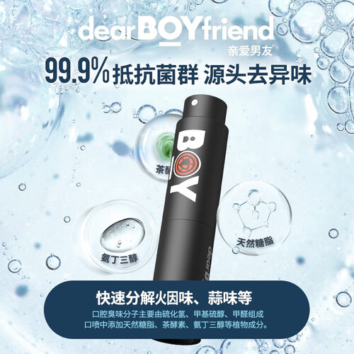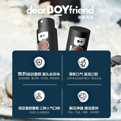 适合男士的口腔喷雾,采用专利口腔护理配方,温和滋润口腔。高达99.9%的抑菌率,从源头解决口气烦恼,让你绽放自信笑容。