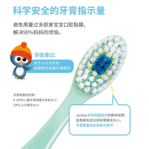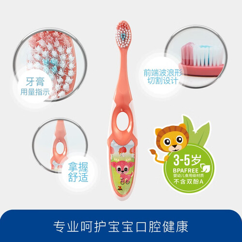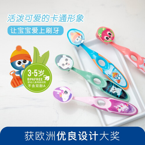 柔软有韧性的刷毛,温和清洁牙齿,不伤宝宝娇嫩的口腔粘膜。符合人体学的手柄,把握舒适度高,易抓取不易脱落。