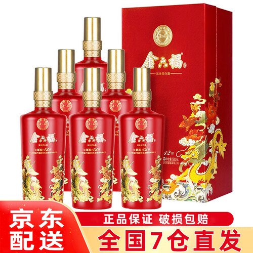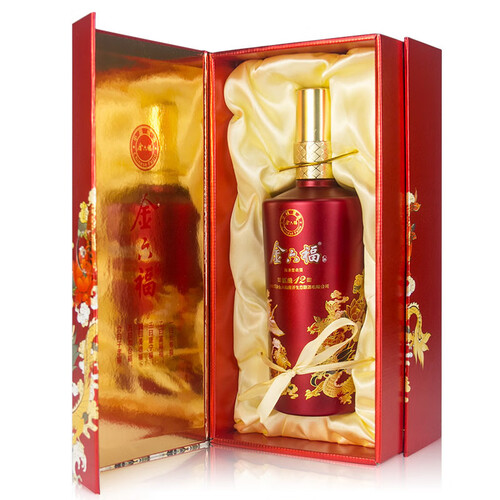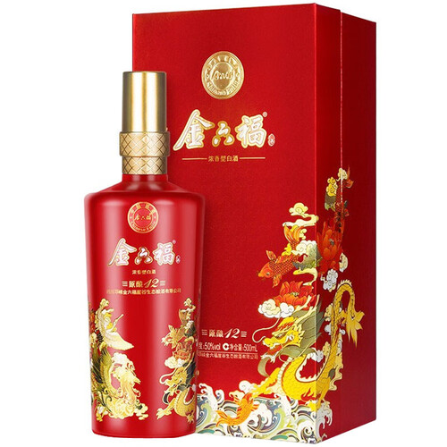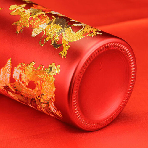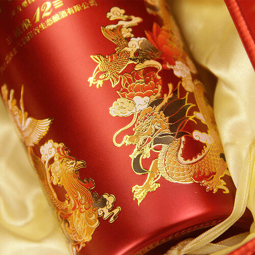 酒瓶采用红金配色,充满了福气。瓶身带有龙凤呈祥图样,寓意祥和美满,适合喜庆场面。立体烤标,质感立现。