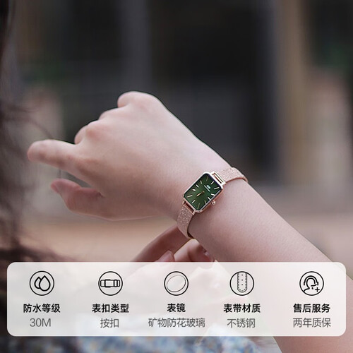 金属麦穗式表带设计,复古和现代混搭,凸显个性设计感。方形无秒针表盘,简约大气有格调,更显女性纤细手腕。