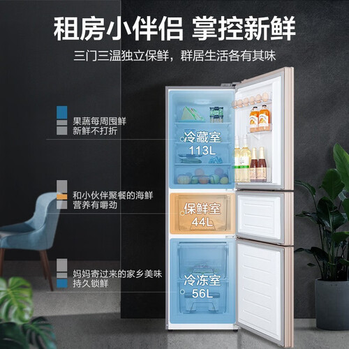 三门三温,不同的内胆进行温度的调节,让不同的食材能够拥有合适的保鲜温度。低温补充,在寒冷的冬天也能正常启动,机器更耐用。