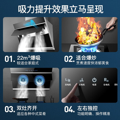 双擎降阻电机动力强劲,增大除烟吸力,做完菜身上不留油烟味。采用1对1直吸设计,还能独立控制两边的吸力,节能瞬吸更省事。