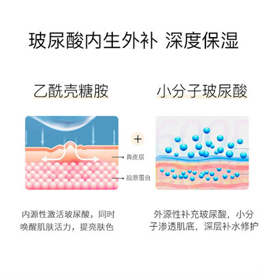 采用透明质酸、乙酰壳糖胺平衡配方,内外双补水,保湿加乘。协同二裂酵母精华,提亮紧致焕白新生,加持多肽协同,抵御肌肤初老。
