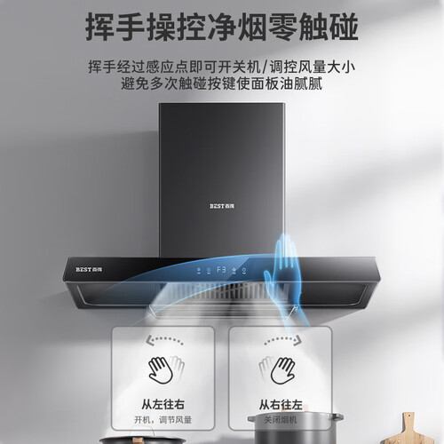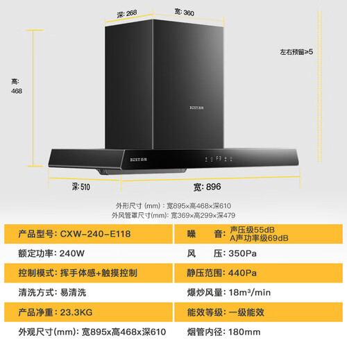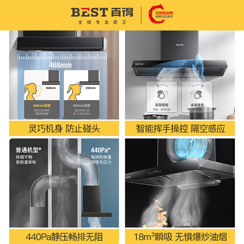 采用纤薄机身设计,美观实用不易碰头,人性化设计使用更安心。内置强劲塑封电机,防油耐腐不易沾染油污,运行平稳低噪。