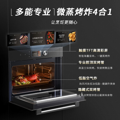 嵌入式微蒸烤一体机,节省厨房空间,一机可满足多种烹饪方式。4.3寸TFT全彩高清屏,支持触屏操作,为懒人带来福音。