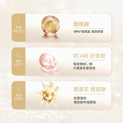 抗黑闭环配方中富含蜀葵花提取物以及烟酰胺等焕白成分,有效预防阻断色素的生成,精准淡化斑点,重塑强韧匀净的无瑕肌肤。