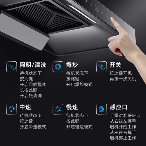 配置强劲拢烟技术,大吸力不残留油烟,更耐用。挥手智能隔空操作,满手的油污不再弄脏面板,洁净不需要打扫。