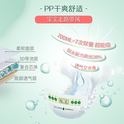 3D棉柔无纺布,好像触摸到云朵的柔软,给宝宝温柔的抚摸。柔软环抱式腰贴设计,更贴合腰围,给宝宝安全感。