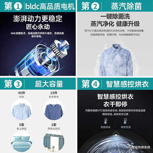 1小时即洗即烘,快速完成洗烘,缩短一大半的洗衣时间。55分贝低音运行,噪音量很低,不会影响家人看电视。