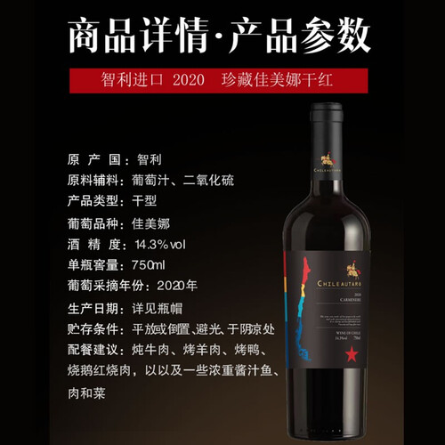 原料产自南美自然山谷,确保酒液散发浓郁果香,助力提升挂杯效果。采用橡木桶陈年酿制,激发酒液呈现优雅的紫红色泽。