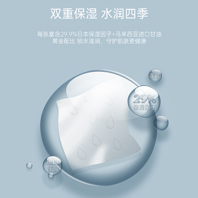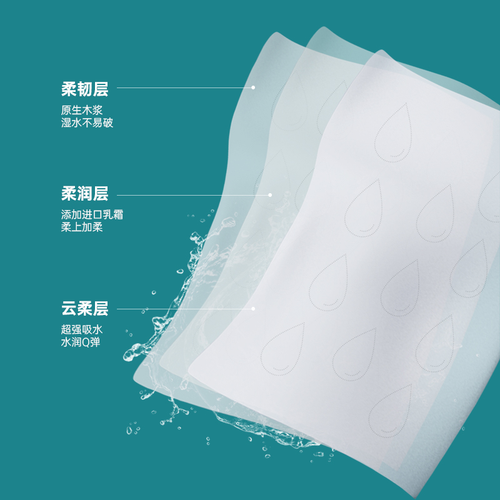 纸巾富含29.9%保湿因子,有助于锁住肌肤中的水分,拒绝干燥起皮。原生木浆原料更柔韧,快速擦干水渍更干爽。