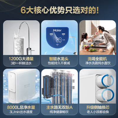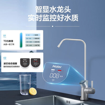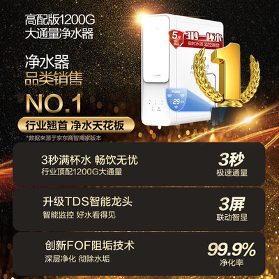 高达1200G大通量出水,水量澎湃,3秒钟就可以接满一杯水,全家饮水无需久等。配备智能数显水龙头,水质状况清晰可见。