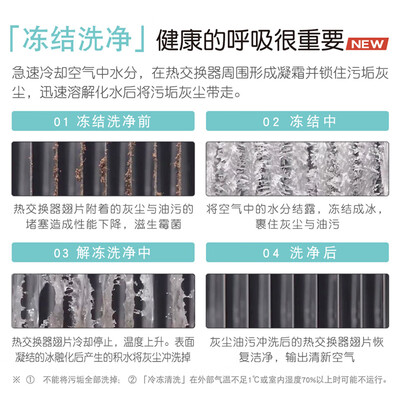 凝霜冻结洗净,锁住污垢灰尘并迅速溶解,将污垢灰尘通通都带走,清洁更彻底。采用R410A新冷媒,不含氯,更环保。