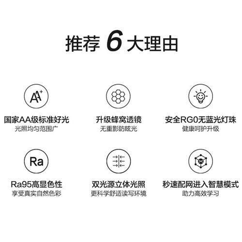 AA级照度,发光效率高,可降低光衰减,照明整个桌面无暗区。拥有高达Ra95高显色性,充分还原物品的真实色彩。