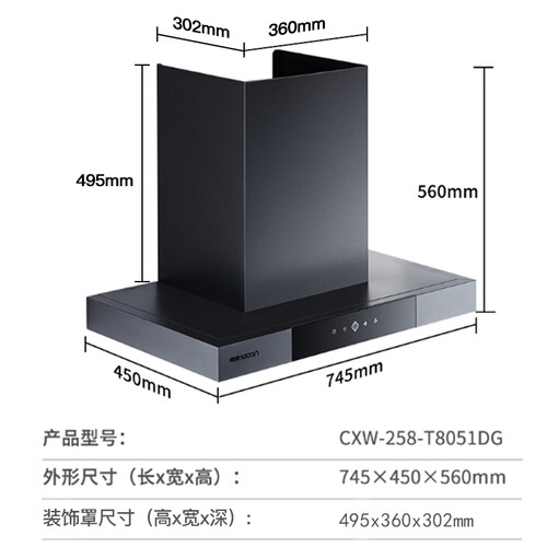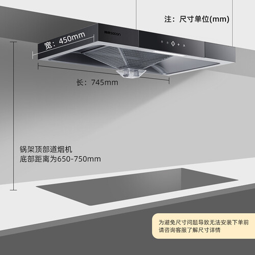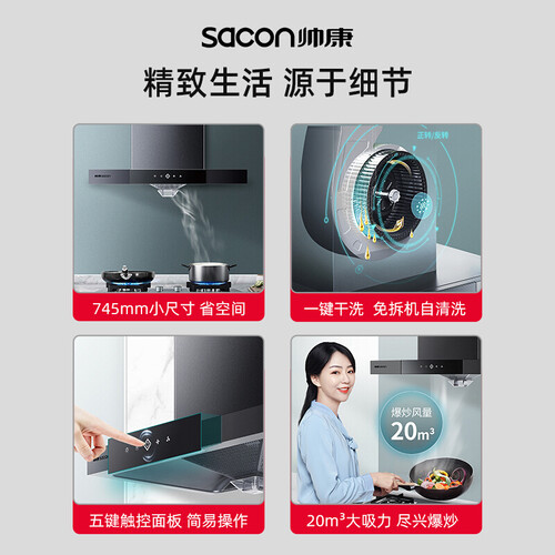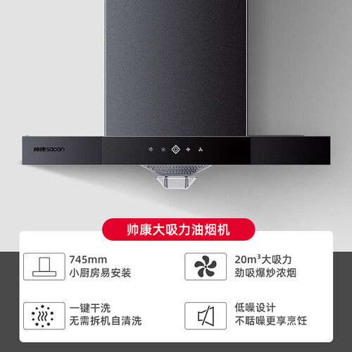 745MM迷你机身设计,可轻松嵌入安装小空间厨房,节省使用空间。20m³强拢吸,快速拢吸升腾油烟,轻松煎烤烹炸。