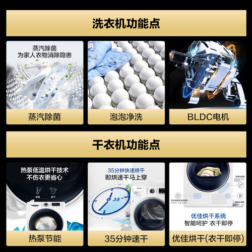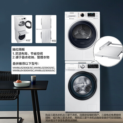 烘干机配置多种程序,满足不同衣物面料的烘干需求。洗衣机的内筒采用加宽设计,空间大兼具洗衣效果和减少衣物褶皱的产生。