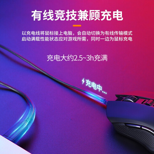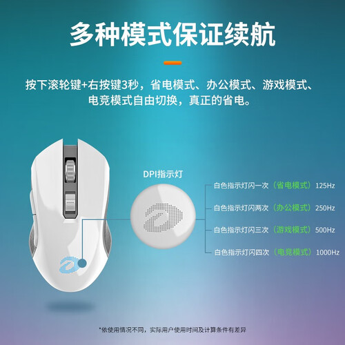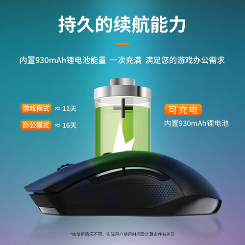 采用人体工程学设计,手感舒适,全天握持都不累。内置充电电池,电竞模式可用11天,办公模式可用16天,续航表现更出色。