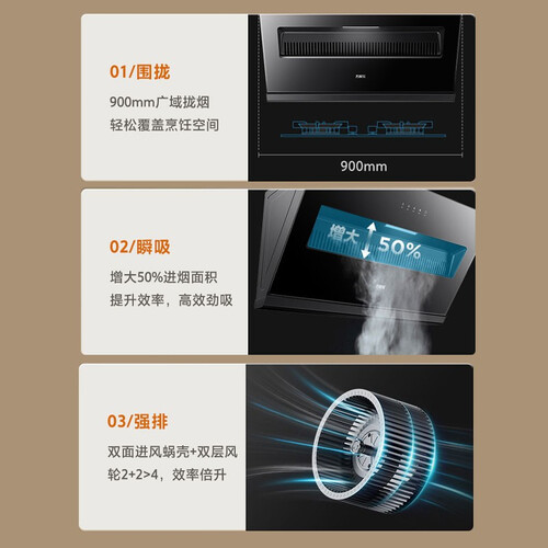 采用双滚珠静音轴承电机,运行声音低至50分贝,静享美好烹饪时光。灶具采用富氧燃烧系统,达到了国家一级能效,使用更节能。