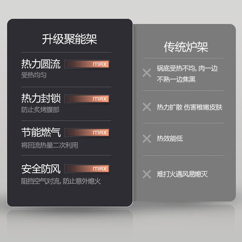 拥有5kW大火力,轻松满足中式爆炒需求,减少美食的等待时间。使用升级聚能架,可以牢牢锁住热量,避免流失。
