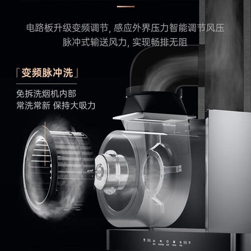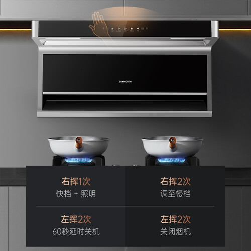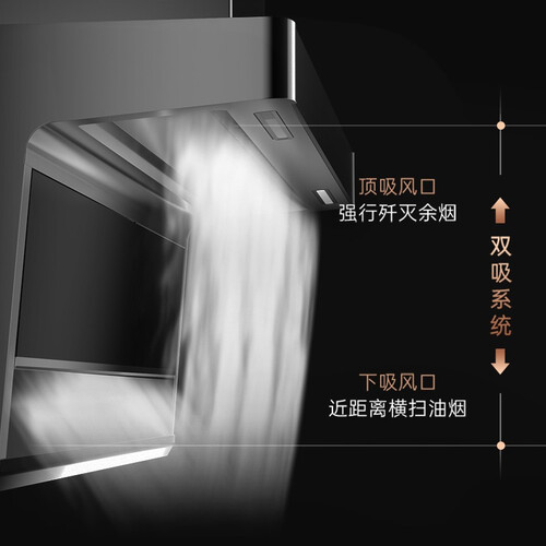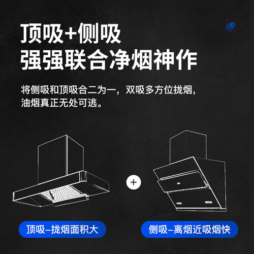 采用顶侧双吸设计,双重保障避免出现油烟残留,倍享清新烹饪。搭载黑镜大屏幕,无需按钮不易藏匿油污,老人孩子也能轻松操作。