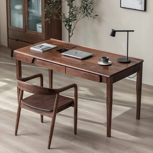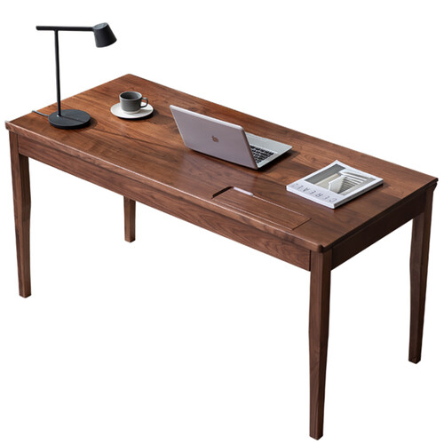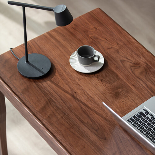 桌面上边缘设计了弧形围边,能够防止铅笔等圆形物件滚落下去。通过榫卯结构连接桌腿与桌面,结合紧密牢固。