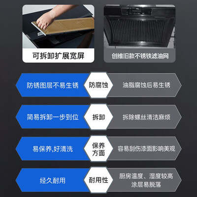 双层油网,提升风速,吸力大烹炒菜肴更畅快。不锈钢的面板,不仅易清洁还耐腐蚀不生锈,经久耐用好打理。