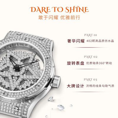 高品质402颗水晶密嵌表盘,璀璨耀眼变身亮眼存在,吸引他人视线。优质轴承360度转动,伴随行走灵动旋转。