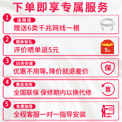 双频合一设计,根据环境自动优选切换,避免相互干扰,网络连接稳定畅快。提供有多个全千兆网口,适应高速光纤需求,一步到位提供疾速网络。
