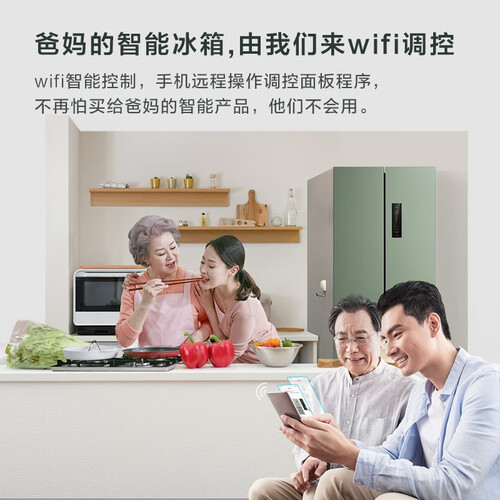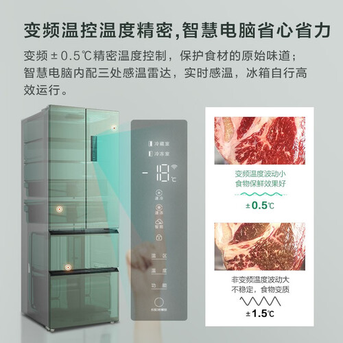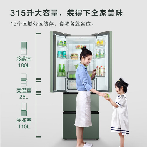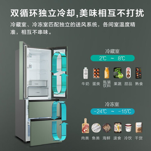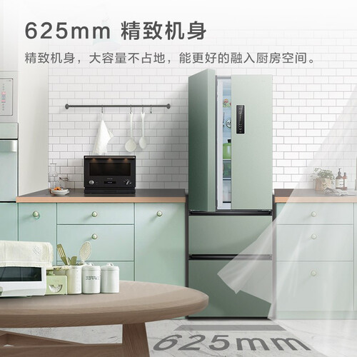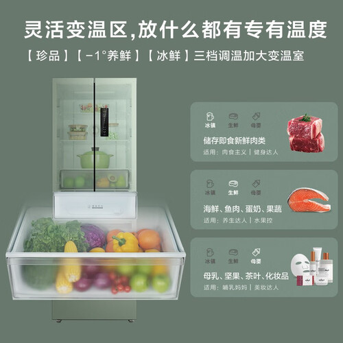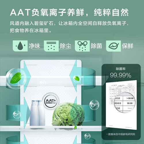 冰箱有冰裂纹肌理与青釉色,十分唯美。风道内融入碧玺矿石,让冰箱内全空间自释放负氧离子,充分实现食材的养鲜。
