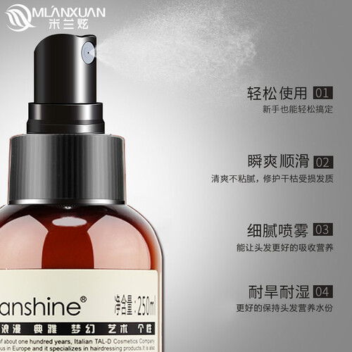 免冲洗配方,使用更加便捷,有效修护干枯毛躁等发质,令秀发顺滑有亮泽。细腻喷雾,营养成分能够更好的被秀发吸收。