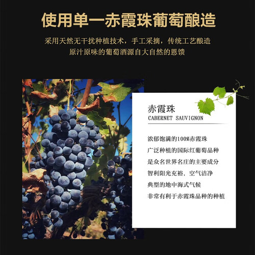 由百分之百的赤霞珠酿造而成,采用好品质葡萄,确保口感醇香细腻。单宁成熟丝滑,绵长悠远的口感,使人难以忘怀。
