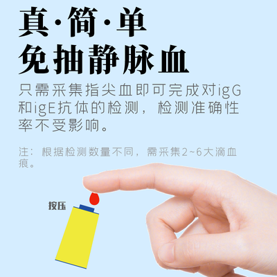 在家采样,无需抽血。只需轻轻按压采集器就能快速采集指尖血,不需要进行静脉抽血,使用更加方便。多项检测,预防未知的过敏隐患。