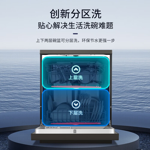 内置搁置架,根据餐具不同进行调节,更加贴心,下次也可以放置锅具进行清洗,两层可以独立清洗,根据餐具数量进行调节。