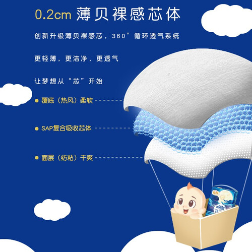 选用0.012mm细纤维,轻薄又亲肤。采用了云芯工艺,让气垫芯的柔软度再一次提升。大量的透气孔让纸尿裤透气不反渗。